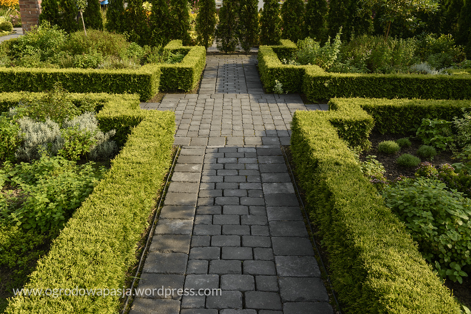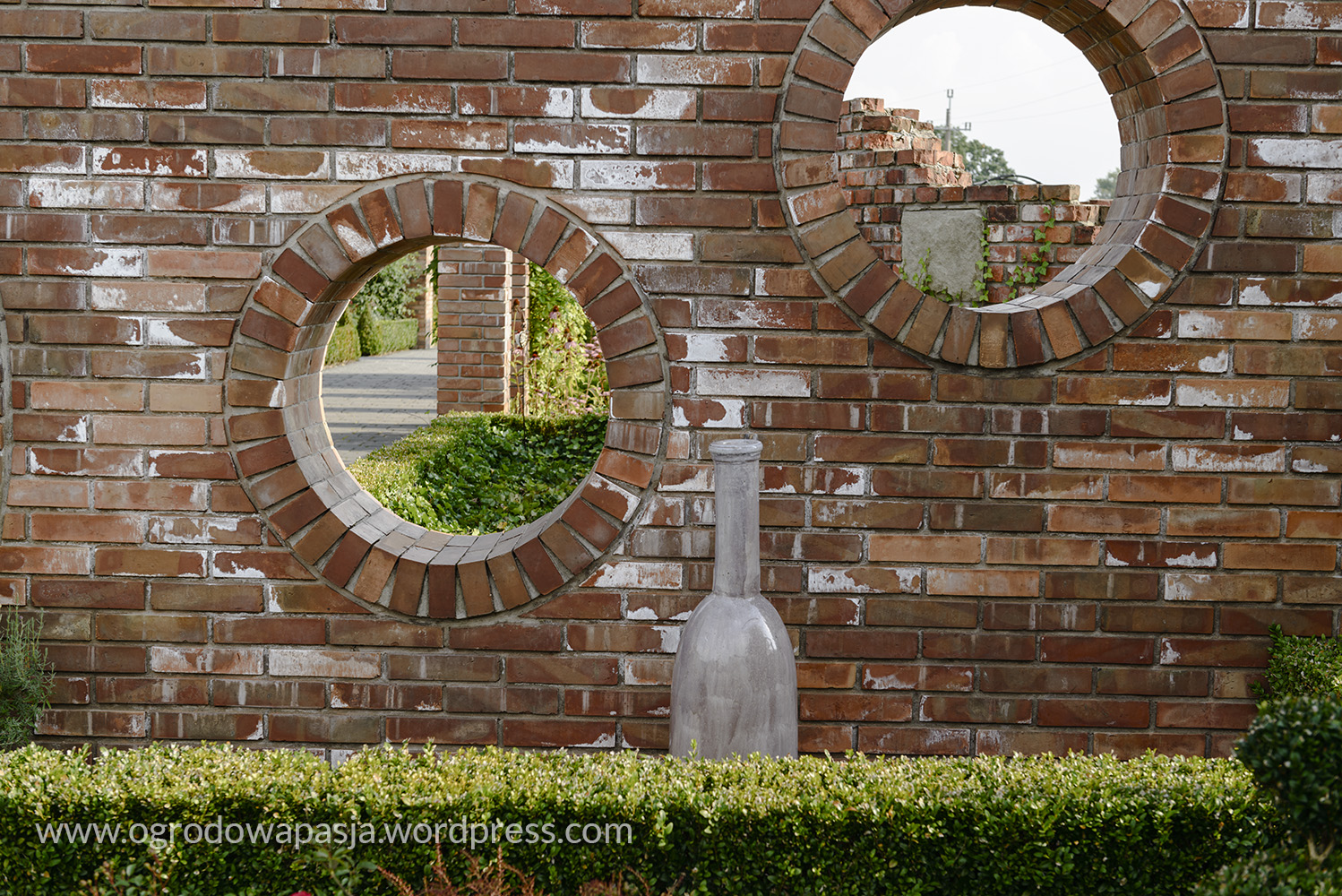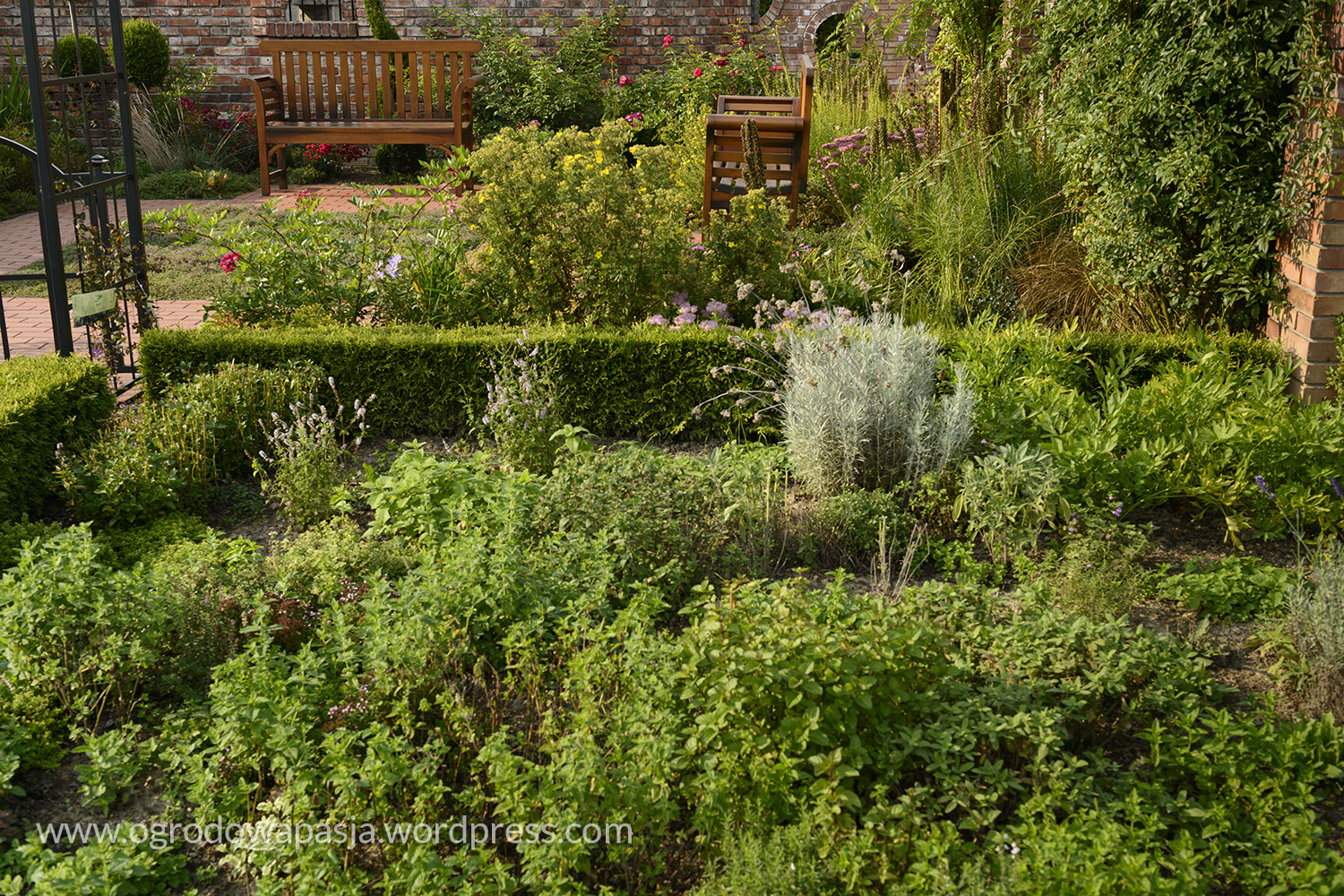 To spore założenie stworzone z 12 wnętrz. Całość w ryzach utrzymują ceglane mury dzielące symetrycznie przestrzeń. Pomagają im w tym bukszpanowe i żywotnikowe obwódki. Do bramy gdzie zaczyna się ogród prowadzi nas aleja lipowa. Dalej przez okrągłą bramę mamy widok na tunel będący jednocześnie pergolą dla pnączy. Na jego końcu zobaczymy ścianę frontową angielskiego domu. Wszędzie wokół kwitnące krzewy i byliny, ale też zakątki z ziołami. Nie brakuje drewnianych mebli, furtek i nadgryzionych zębem czasu detali. Wszystko to tworzy malowniczą przestrzeń, która przenosi nas na Wyspy.