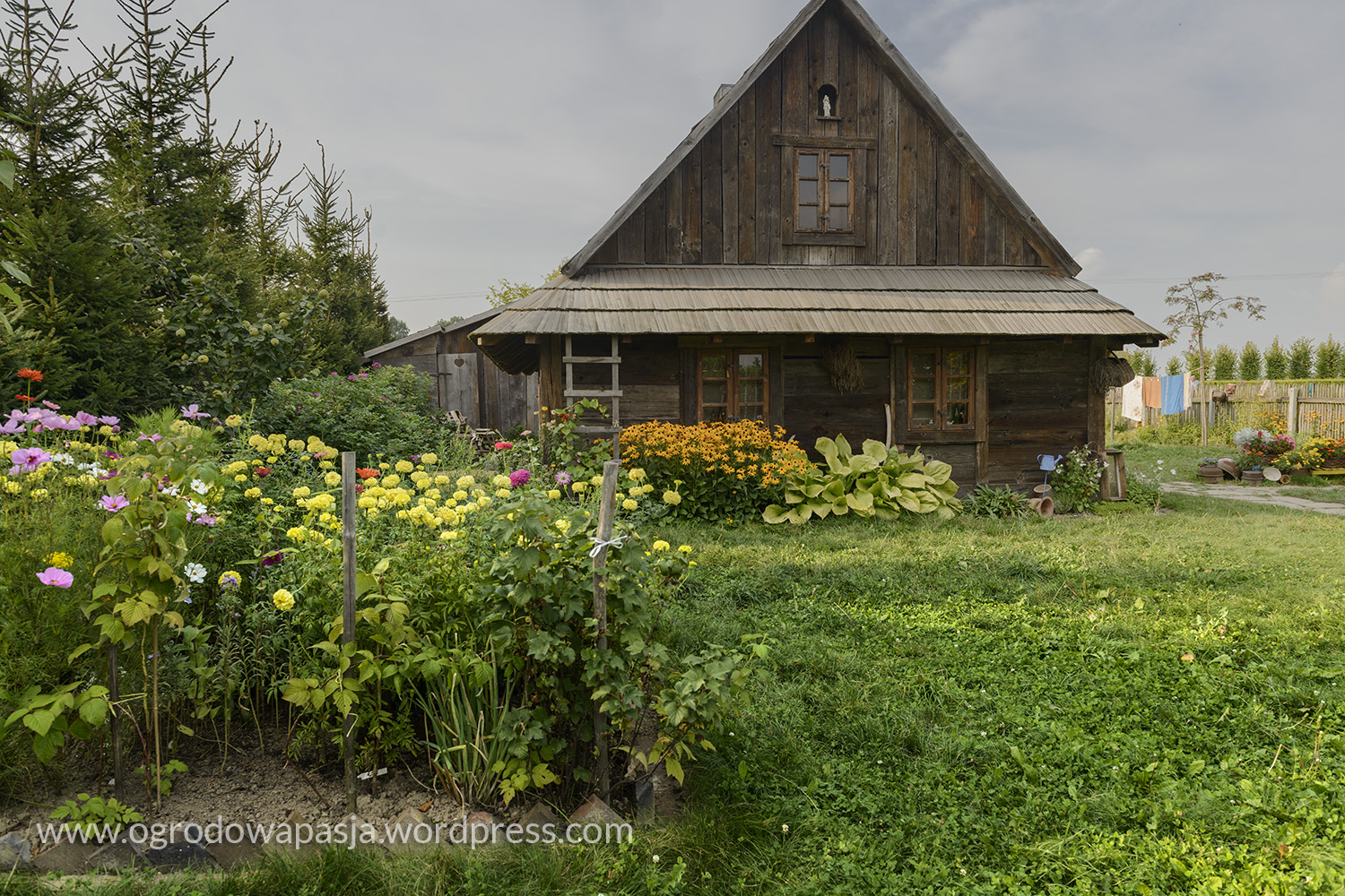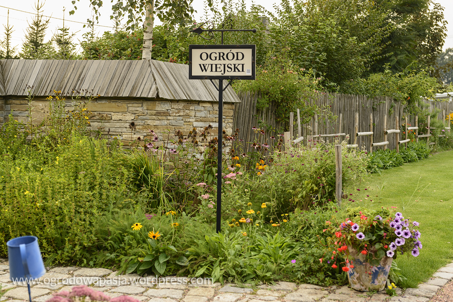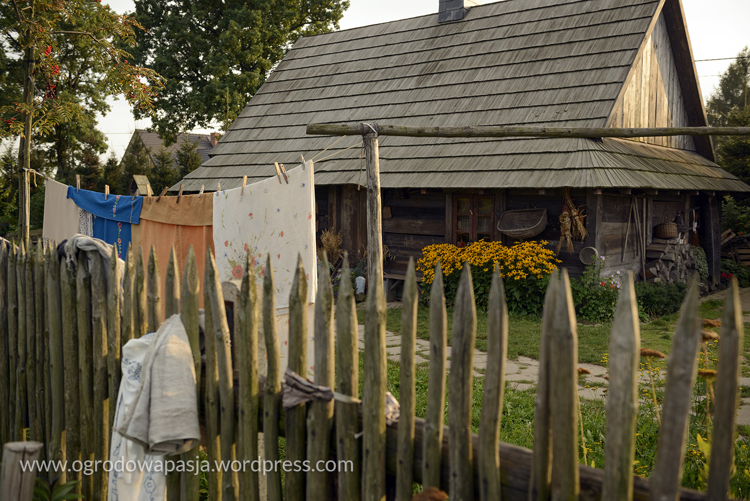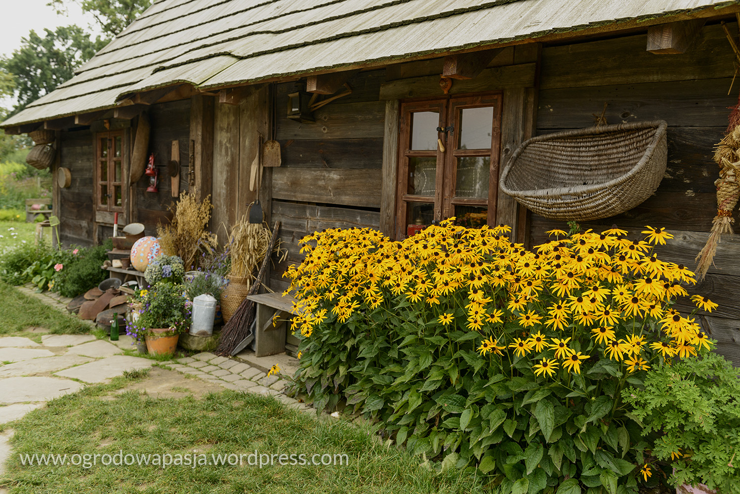 Przenosimy się kilkadziesiąt a może nawet sto lat wstecz. Wiejska chata a przy niej rudbekie, kocimiętka, kocanki, zioła i warzywa. Próżno szukać tu przystrzyżonego trawnika. Miękko pod stopami robi nam przygnieciona już trawa wymieszana z tym co akurat się wysiało- mniszek, koniczyna… Na sznurku suszy się pranie, na płocie naczynia, a wokół chaty zioła. Do tego jarzębina, lipa i kapliczka ze św. Franciszkiem. Ziemiankę porasta kocimiętka… sielsko . Tylko widok na położony tuż obok ogród ciszy nieco burzy ten spokój. Może gdyby zamiast miskantów tło tworzyła kukurydza?