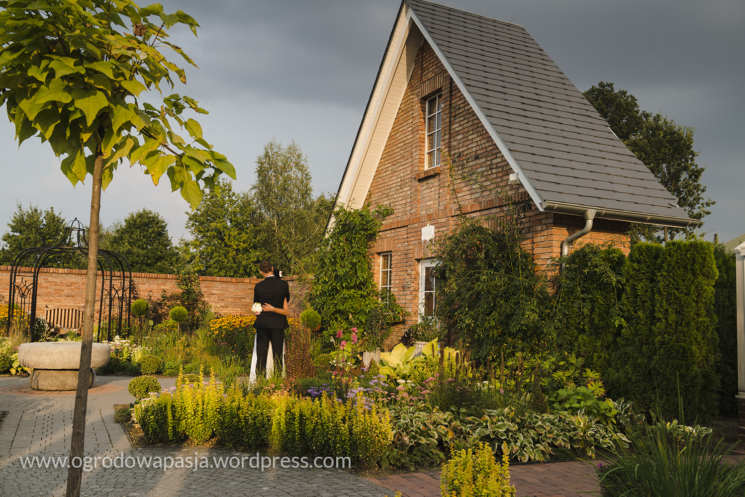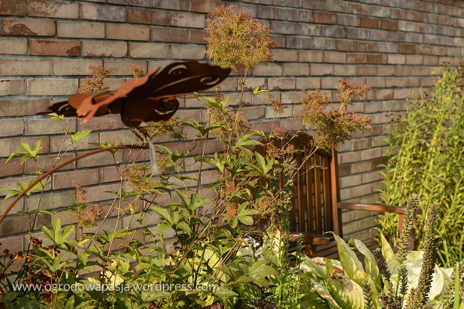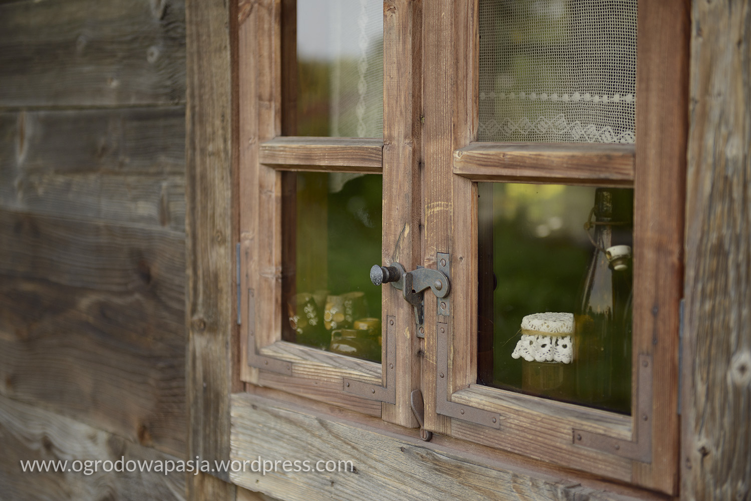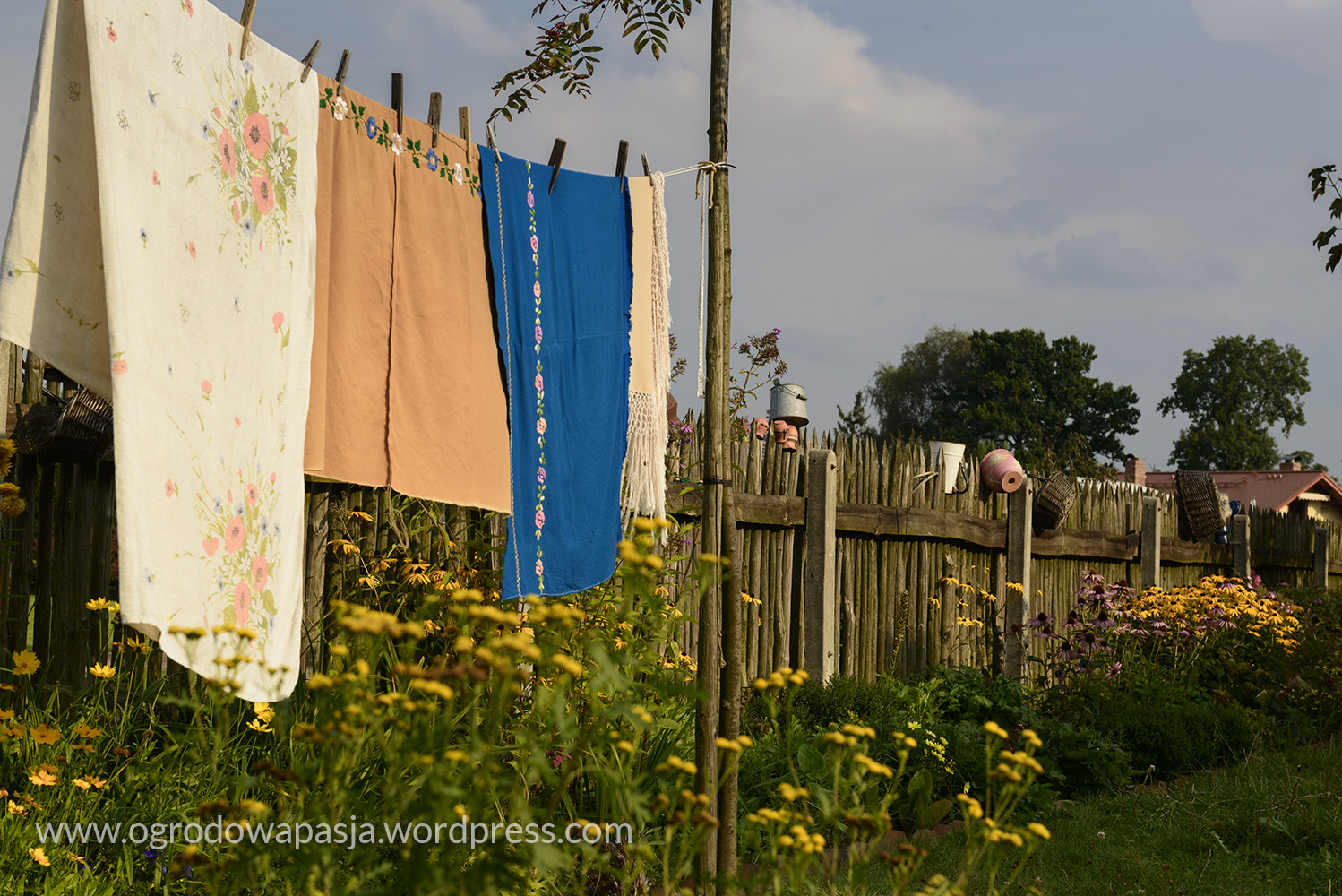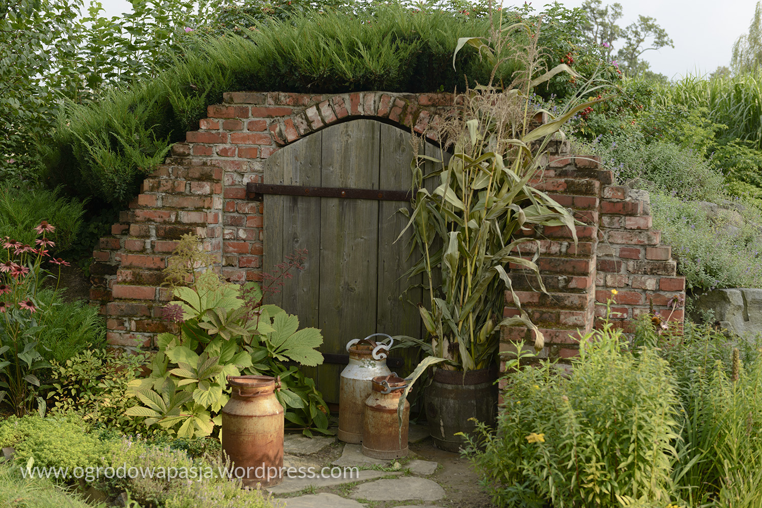Przenosimy się kilkadziesiąt a może nawet sto lat wstecz. Wiejska chata a przy niej rudbekie, kocimiętka, kocanki, zioła i warzywa. Próżno szukać tu przystrzyżonego trawnika. Miękko pod stopami robi nam przygnieciona już trawa wymieszana z tym co akurat się wysiało- mniszek, koniczyna… Na sznurku suszy się pranie, na płocie naczynia, a wokół chaty zioła. Do tego jarzębina, lipa i kapliczka ze św. Franciszkiem. Ziemiankę porasta kocimiętka… sielsko . Tylko widok na położony tuż obok ogród ciszy nieco burzy ten spokój. Może gdyby zamiast miskantów tło tworzyła kukurydza?