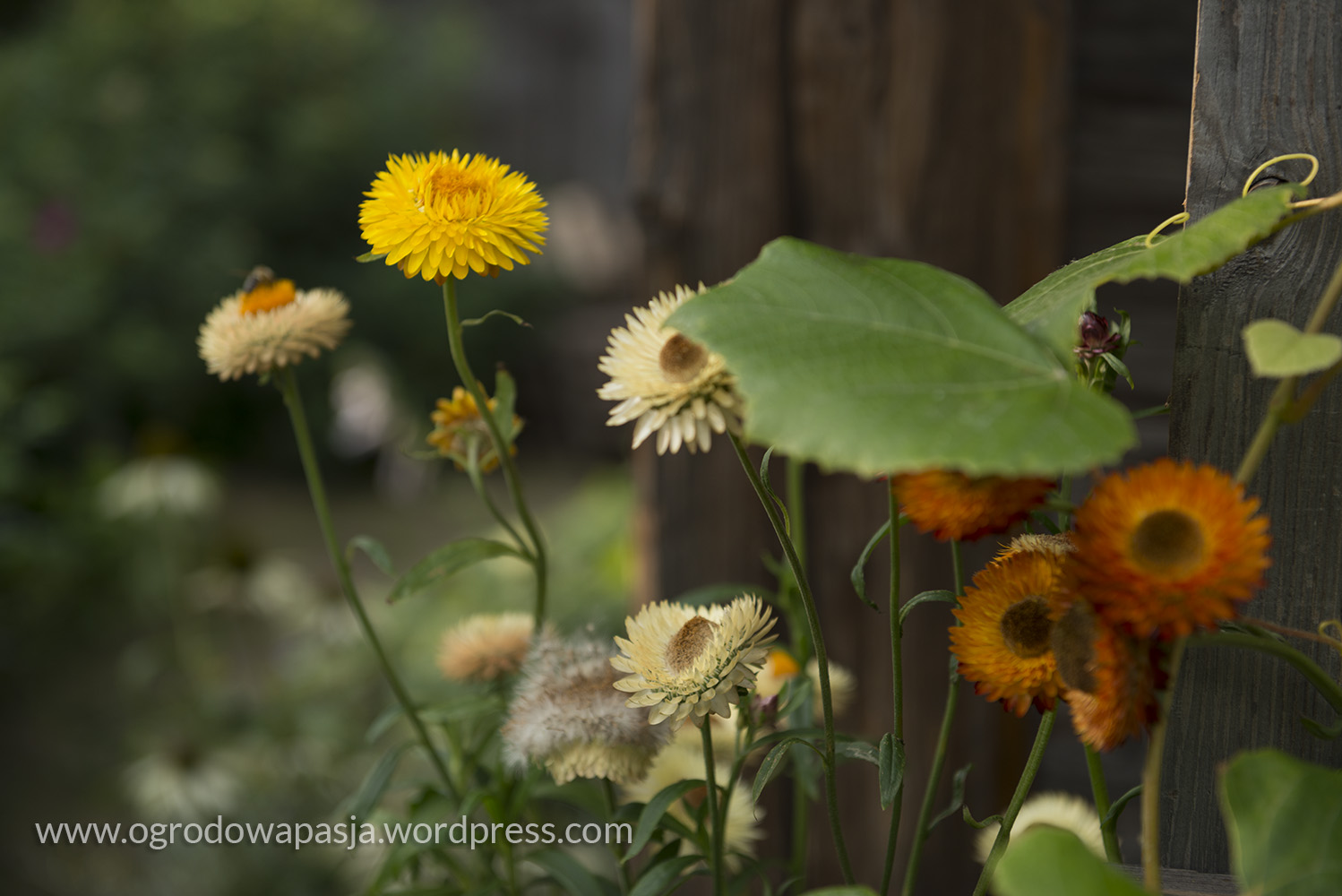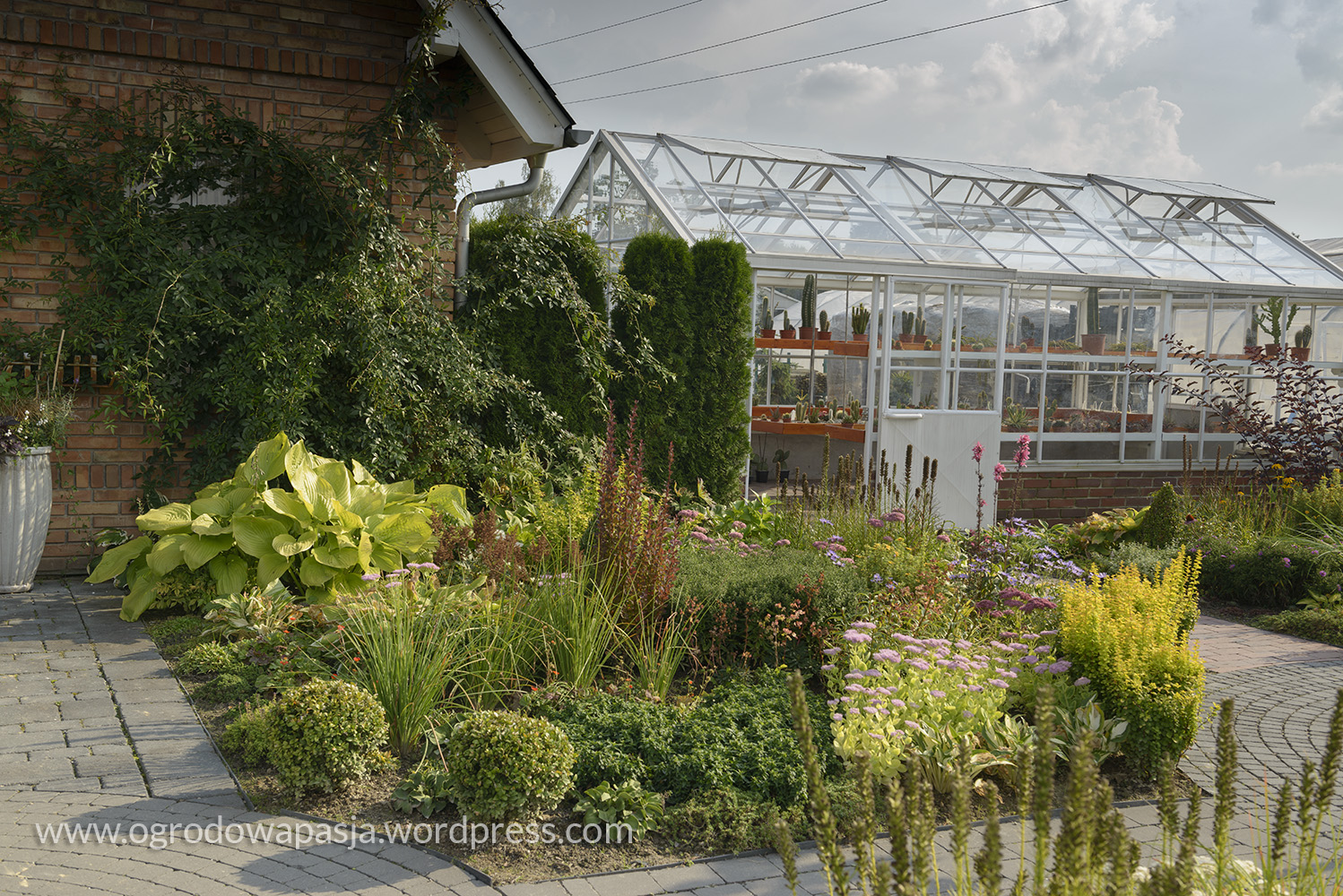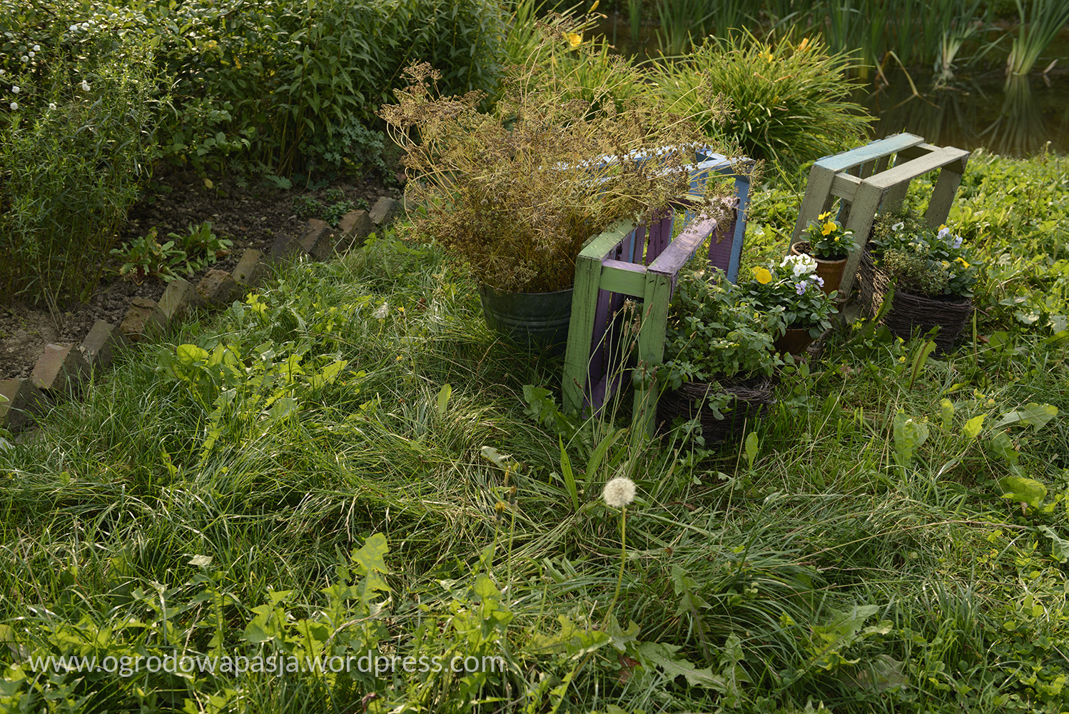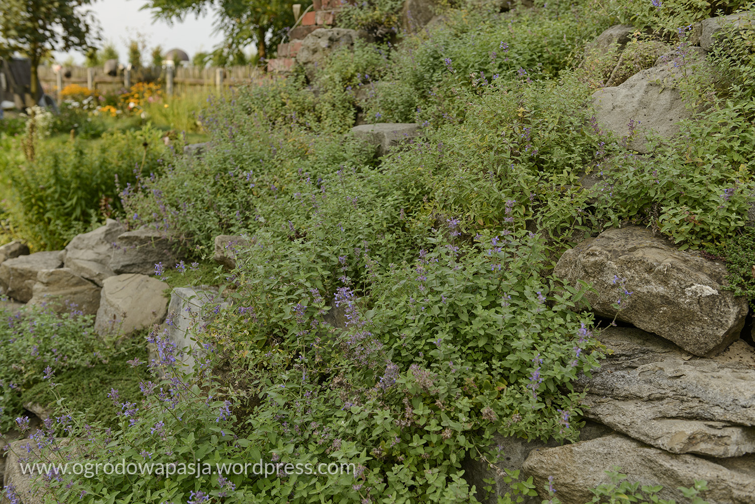 Przenosimy się kilkadziesiąt a może nawet sto lat wstecz. Wiejska chata a przy niej rudbekie, kocimiętka, kocanki, zioła i warzywa. Próżno szukać tu przystrzyżonego trawnika. Miękko pod stopami robi nam przygnieciona już trawa wymieszana z tym co akurat się wysiało- mniszek, koniczyna… Na sznurku suszy się pranie, na płocie naczynia, a wokół chaty zioła. Do tego jarzębina, lipa i kapliczka ze św. Franciszkiem. Ziemiankę porasta kocimiętka… sielsko . Tylko widok na położony tuż obok ogród ciszy nieco burzy ten spokój. Może gdyby zamiast miskantów tło tworzyła kukurydza?