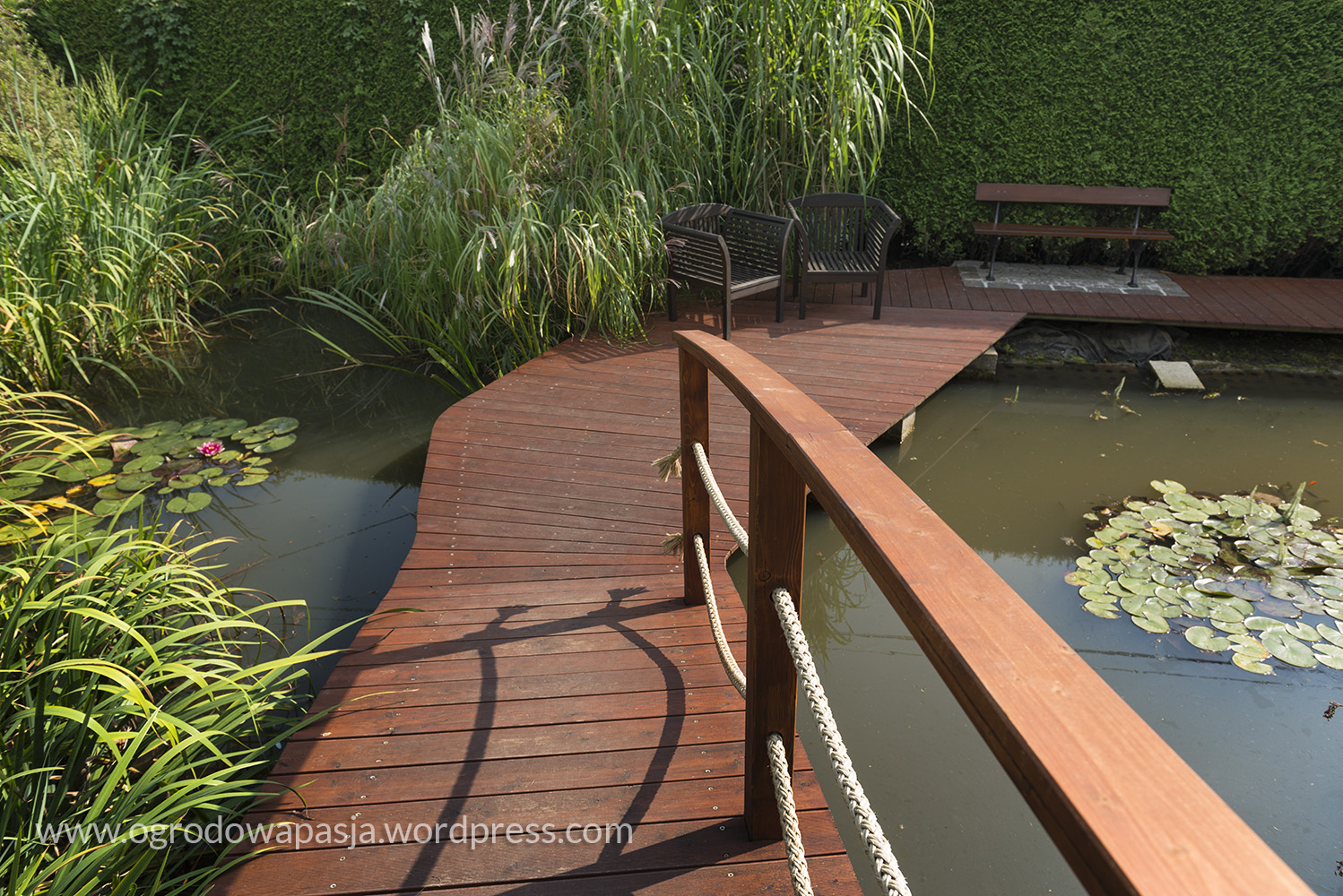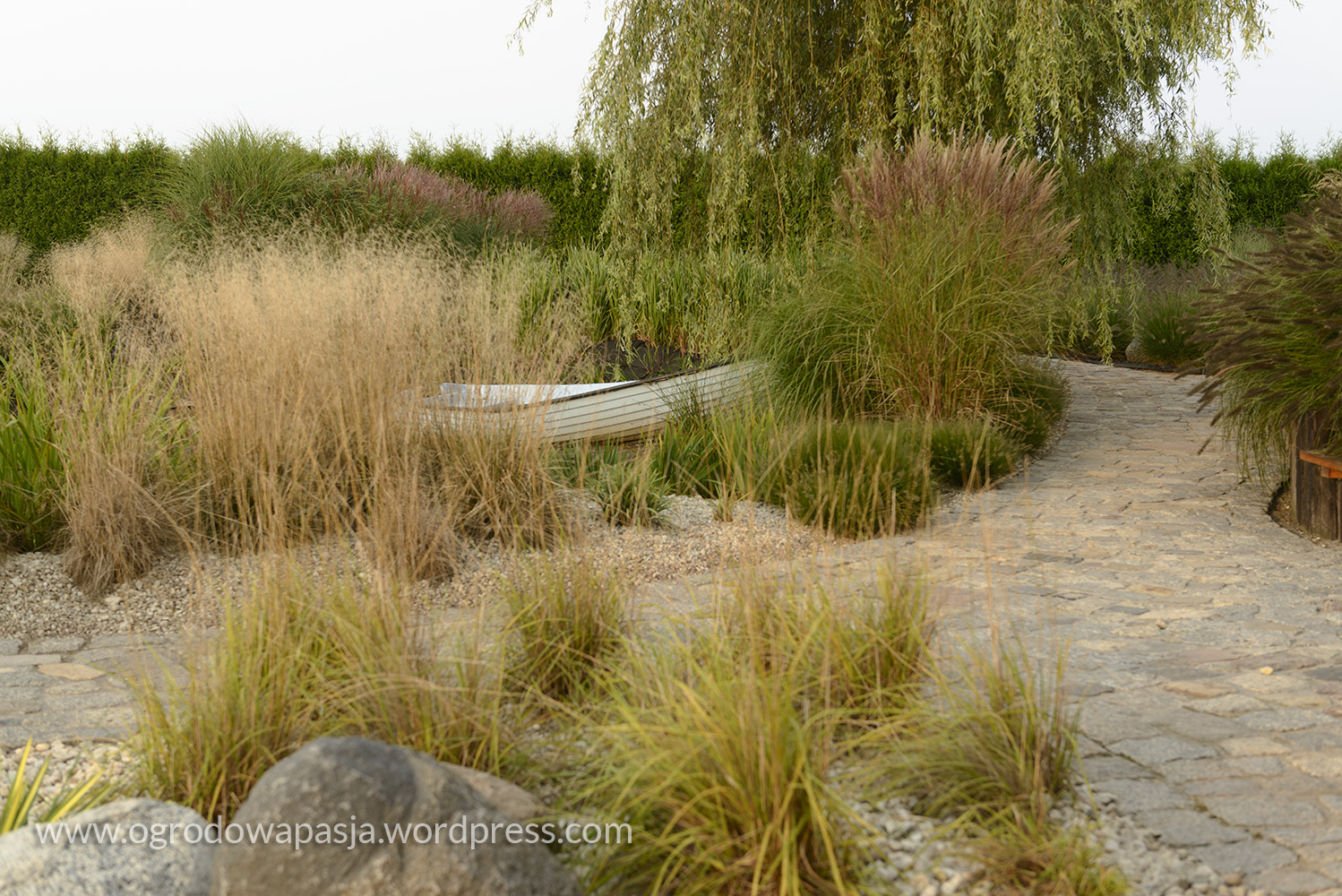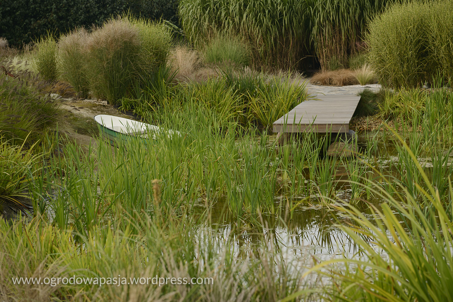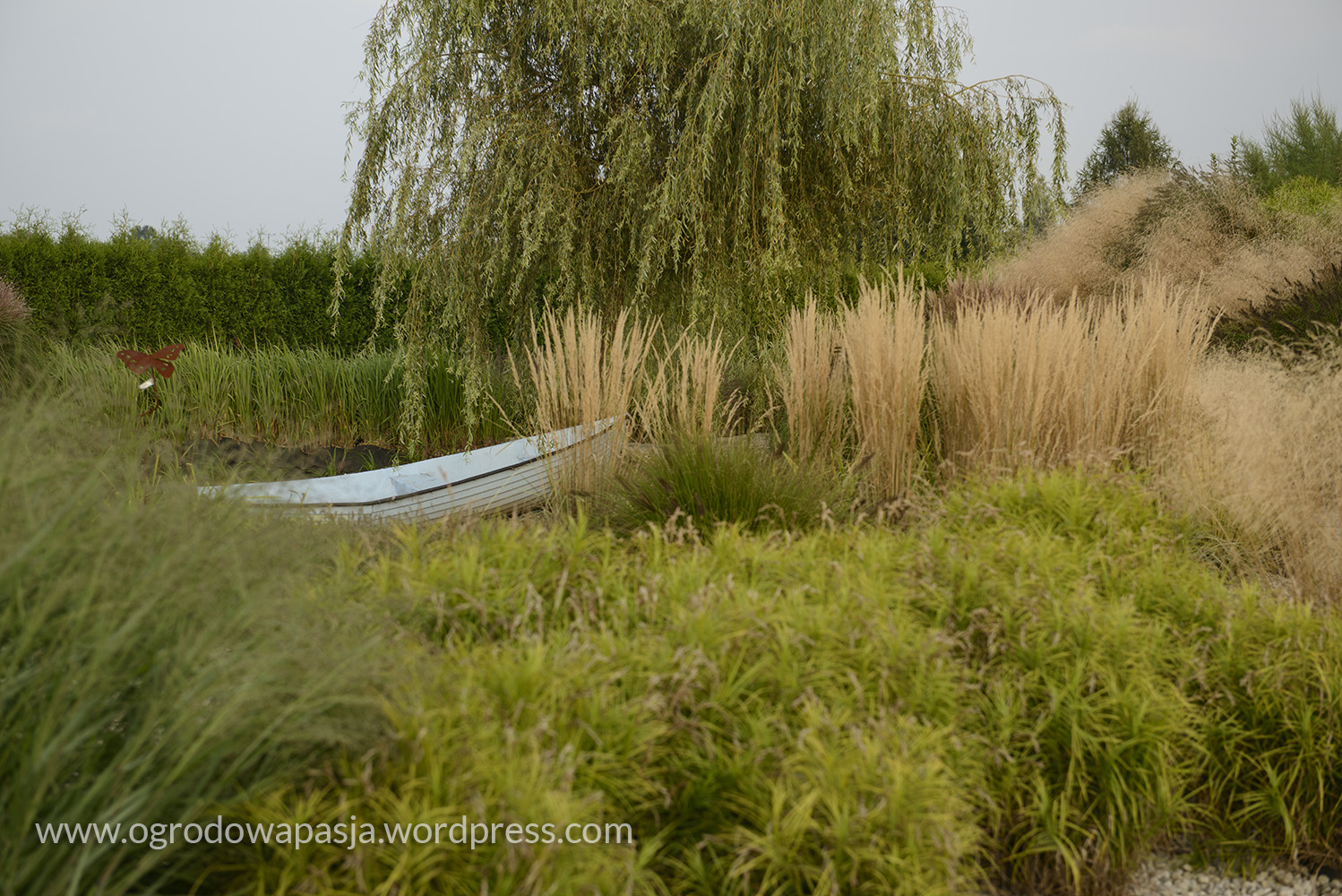 W nim się zakochałam. Poważnie. Lubię trawy ozdobne, ale takiej czystości w ich użyciu jeszcze nie spotkałam. Warto odwiedzić to miejsce chociażby ze względu na ten ogród własnie. Tylko zielenie, szarości, brązy i te słomkowe chmury kwiatostanów. Do tego płytki zbiornik z drewnianym pomostem i przycumowaną łódką. Smerfowy domek pominę, bo wolałabym żeby go tam nie było ;) Zobaczcie sami jakie to piękne: