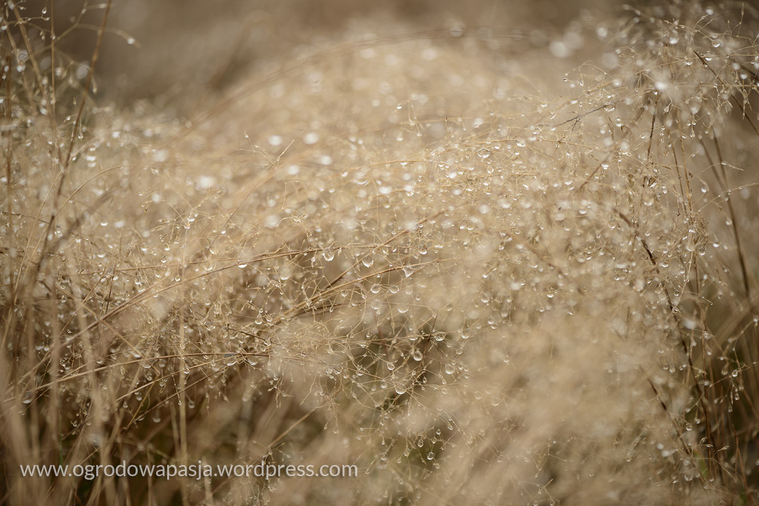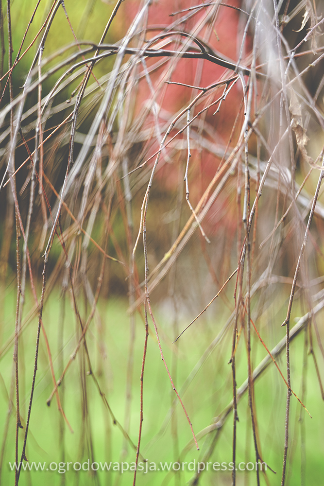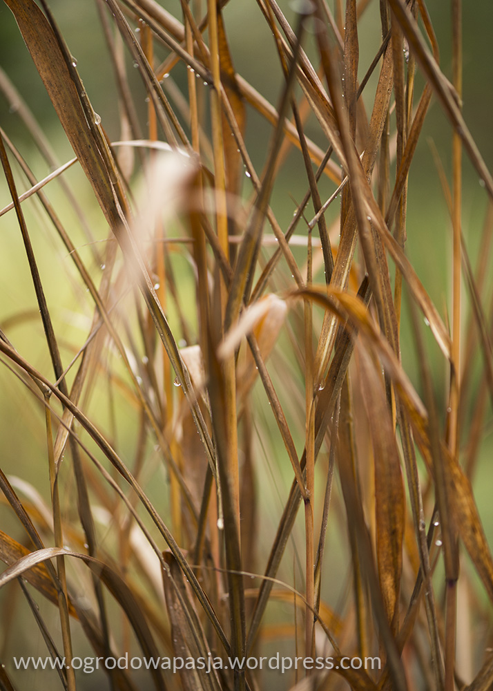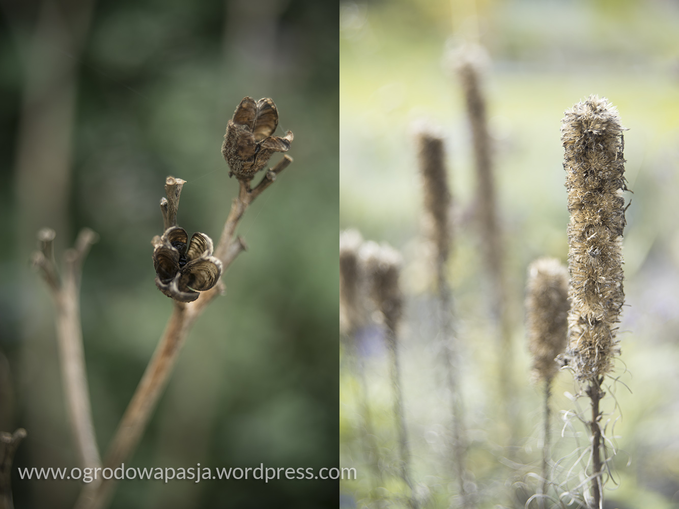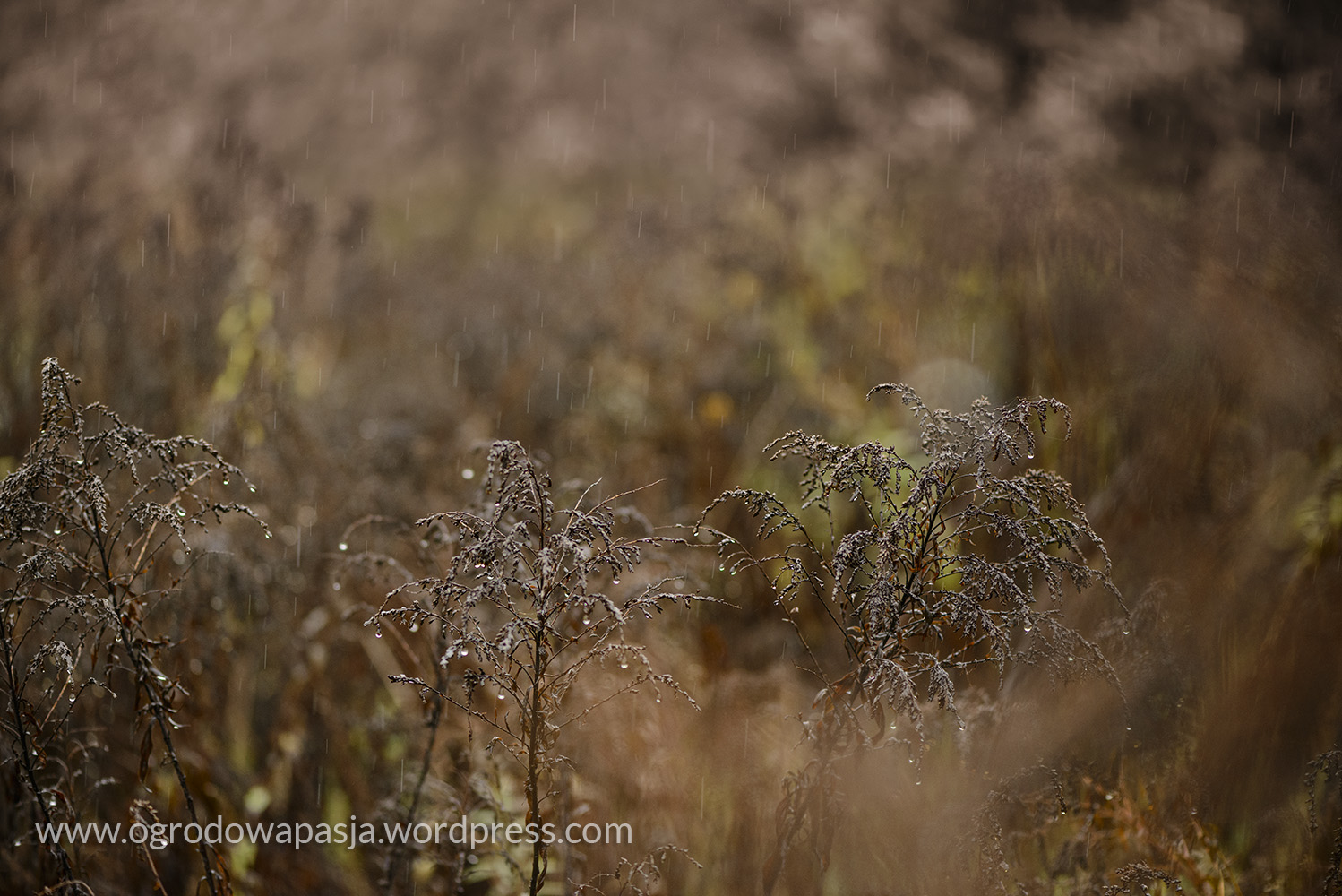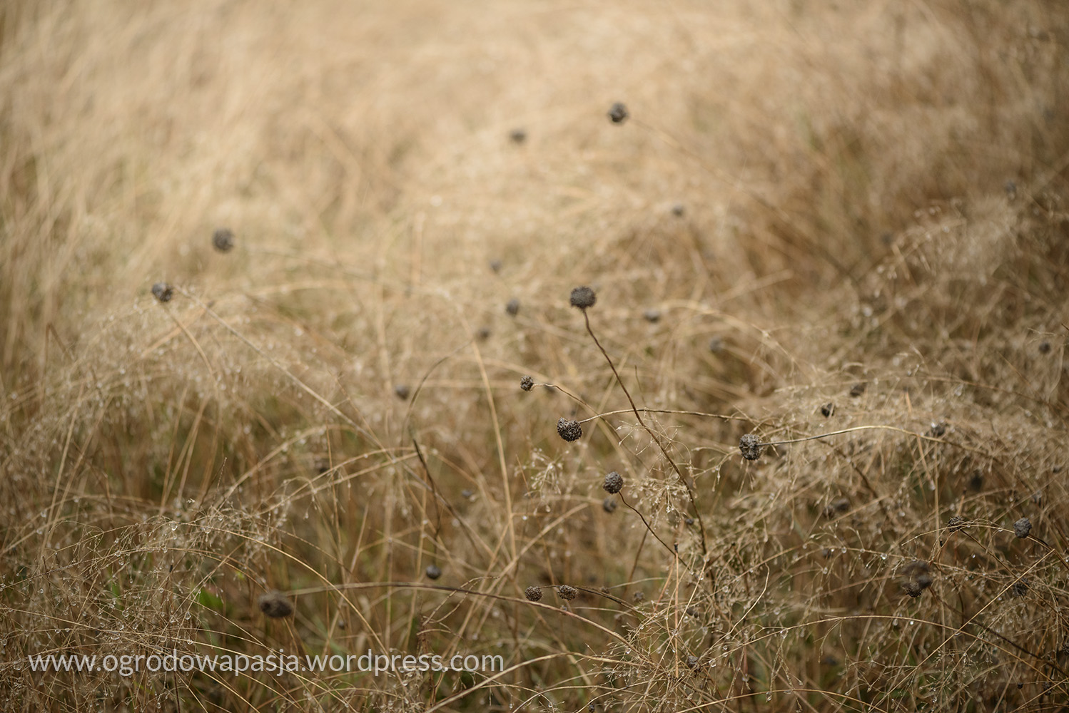 Ta twarz jesieni wydaje się być smutniejsza, ale ma swój cel. Wzrok musi w końcu odpocząć, umysł wyciszyć. Rośliny muszą wydać nasiona i zapaść w sen. Naturalna kolej rzeczy. Kiedy już wszystko powolutku przybiera kolor rdzawy, słomkowy, brązowy widać jak na dłoni samą konstrukcję ogrodu. Widać pokrój drzew i krzewów, widać fakturę jaką tworzą zaschnięte liście traw, nieściętych bylin czy gołych już gałęzi. To też ma swój niewątpliwy urok. Nie lubię ogrodów w przeważającej części zimozielonych ,uzupełnianych tylko w sezonie niewielkimi plamami bylin czy kwiatów rocznych. Ogród dla mnie musi być żywy, a to oznacza zaakceptowanie faktu, że czasem nie widać tego, że taki właśnie jest. Czasem musi umrzeć na chwilę. Wychodzi ze mnie miłośniczka ogrodów naturalistycznych- to jest cecha, której ukryć się nie da.