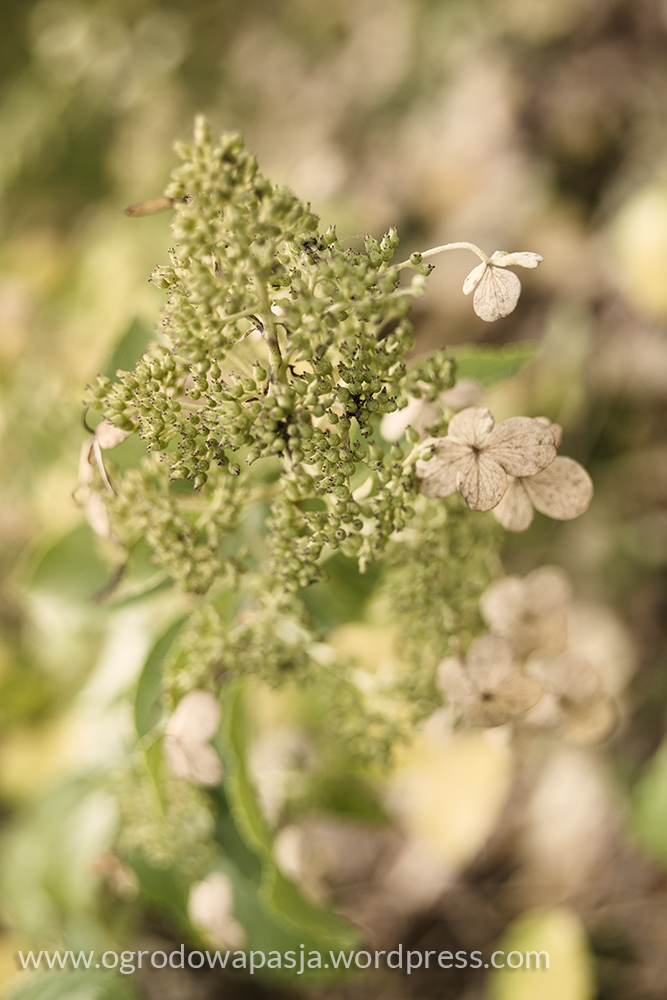 Jest jeszcze kilka roślin, których kwiaty są wciąż obecne na moich rabatach. Należą do nich przede wszystkim jeżówki, które słabiutko, ale kwitną. Szałwia omszona także nie daje za wygraną. Kwiaty hortensji bukietowych już pozasychały, ale za to na ogrodowej wciąż widnieją dwie niewielkie kule. Rozmiarem nie dorównują tym pierwszym, ale dobre chęci zawsze należy doceniać.Oprócz tego dalej zakwita kocimiętka (to już mnie nie dziwi) rdest Auberta tworzący piękny biały puch oplatający u mnie siatkę (wrrr-siatka) a także słoneczniczki, które są najprawdopodobniej tym co nazywamy topinamburem. Pewności mi brak, bo przyplątało się toto gdzieś z nawłocią, ale główne cechy pasują. Wiosną wykopałam ich kilka ,aby sprawdzić czy mają korzenie czy bulwy i poprzesadzałam trochę na nieco bardziej zagospodarowane miejsce razem z astrami. Wdzięczne to kwiaty a bulwy jadalne i ponoć pyszne. Niestety rozchodnik okazały to w tym roku u mnie porażka (nawet wam go nie pokażę) . Pojawiła się potrzeba aby go podzielić dosyć późno (miał już kwiaty) i nie wyszło mu to na dobre. W przyszłym roku sobie odbije. Gdzieniegdzie pojawiają się resztki innych kwiatów, ale ma to charakter raczej milej niespodzianki niż czegoś co widać z daleka.
