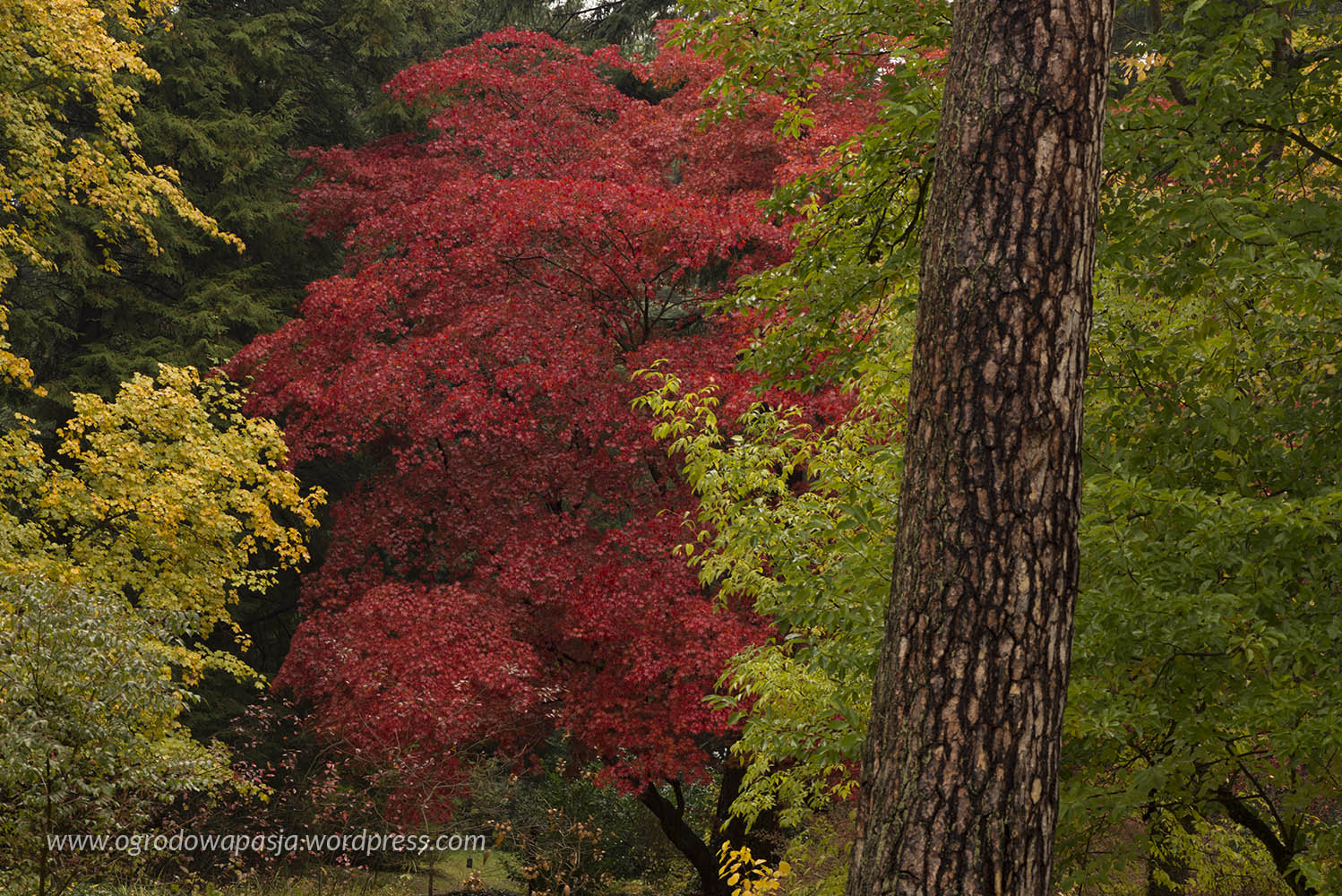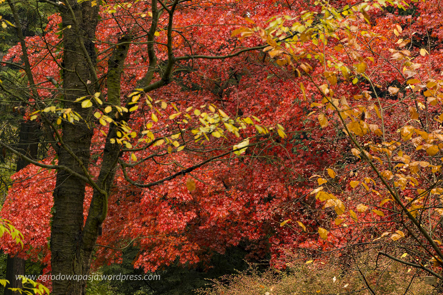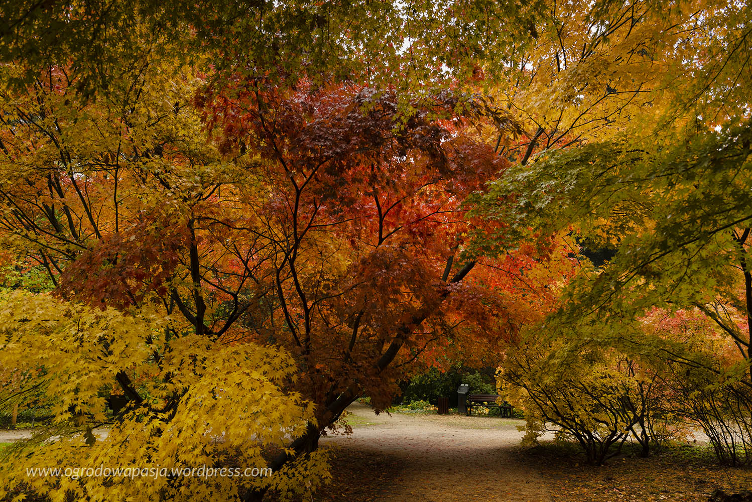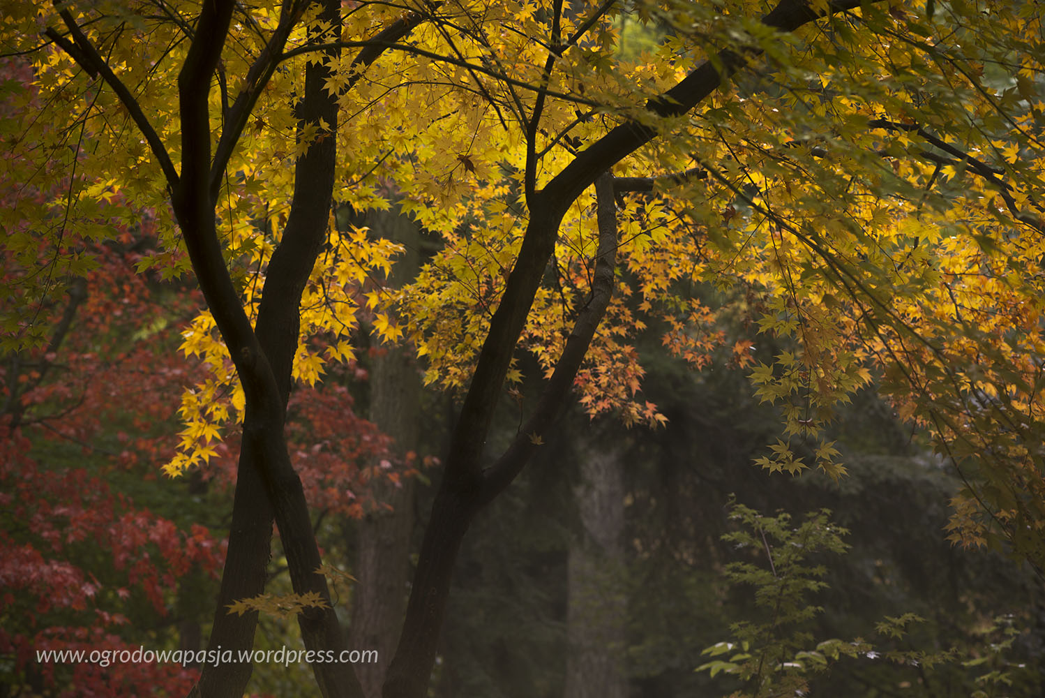 Skoro o zdjęciach mowa. Dzień był pochmurny i mżysty- idealny do fotografowania tak ciężkich kolorów jak żółć, pomarańcz czy czerwień. Liczyłam co prawda na klimatyczne mgły, ale te pojawiały się tylko na chwilę i zaraz ustępowały. Uwierzcie mi, że przygotowując zdjęcia na stronę robiłam to w kolejności: dwa zdjęcia klonów, inne, inne, inne, dwa zdjęcia klonów, inne, inne… Nie dało się inaczej. Wzrok niemiłosiernie się męczył :) Piszę o klonach, ale prawda jest taka, że w czasie naszej wizyty jedynie klony japońskie i palmowe znajdowały się w szczytowej fazie przebarwienia. Większość drzew szykuje się jednak ze swym barwnym spektaklem na nadchodzący weekend. Chciałabym i ja ponownie tam zajrzeć, ale czy się uda? Czas pokaże :) Mam cichą nadzieję, że jest wśród was ktoś, kto dzięki mojej fotorelacji spakuje plecak, kanapki i aparat fotograficzny (koniecznie) i ruszy do Rogowa :) Na pewno nie pożałuje.