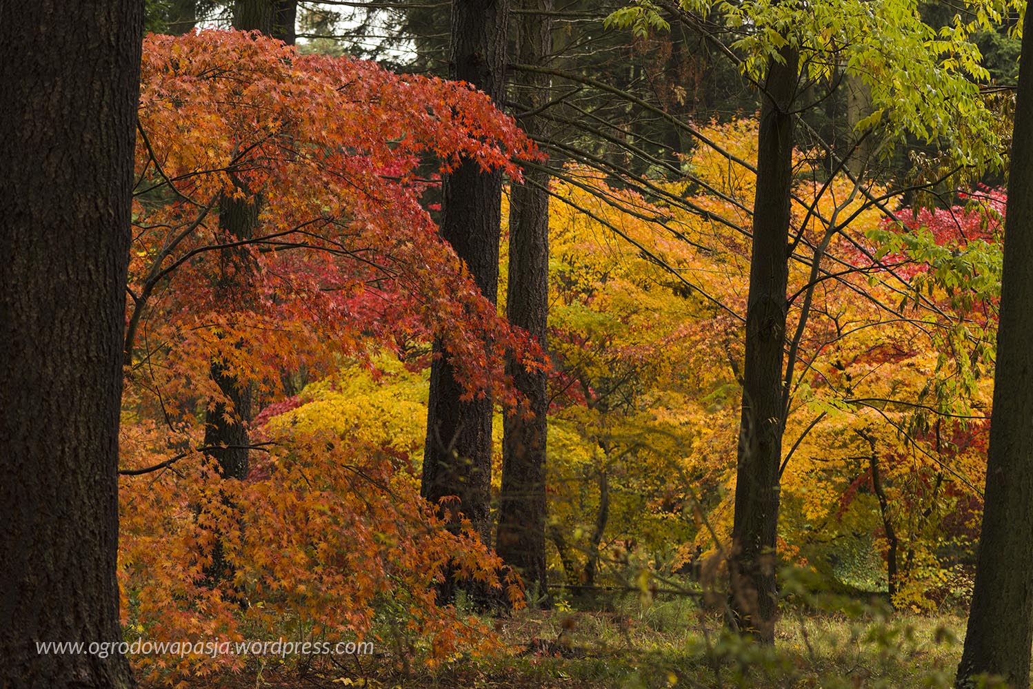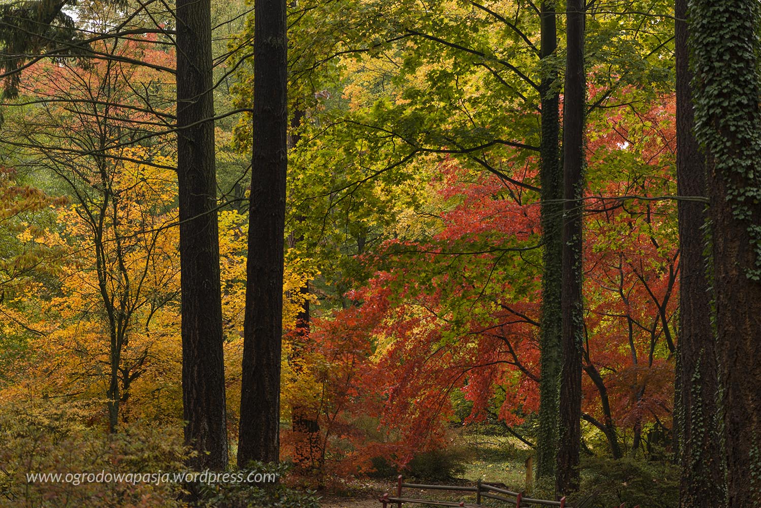 Trochę rozczarowały mnie ambrowce. Drzewa określane są mianem najpiękniej przebarwiających się jesienią. Zgadzam się z tym w całej rozciągłości. Pokazywałam was zresztą jakie barwy potrafią przybrać ich liście tutaj. Jednak te rogowskie były jakieś takie… rzadkie. Widzę oczywiście, że wiele liści ściele się już po ziemi, ale chyba jednak chodzi tu o coś więcej. Cały ogród mieszczący tak potężną kolekcję drzew jest jednocześnie nieco ciemny. Myślę, że może mieć to wpływ na pokrój drzewa, tym bardziej, że same ambrowce rosną również w niewielkiej grupie. Te posadzone z jednej strony miały już całkiem ładnie wybarwione liście, te po przeciwnej były jeszcze całkiem zielone.