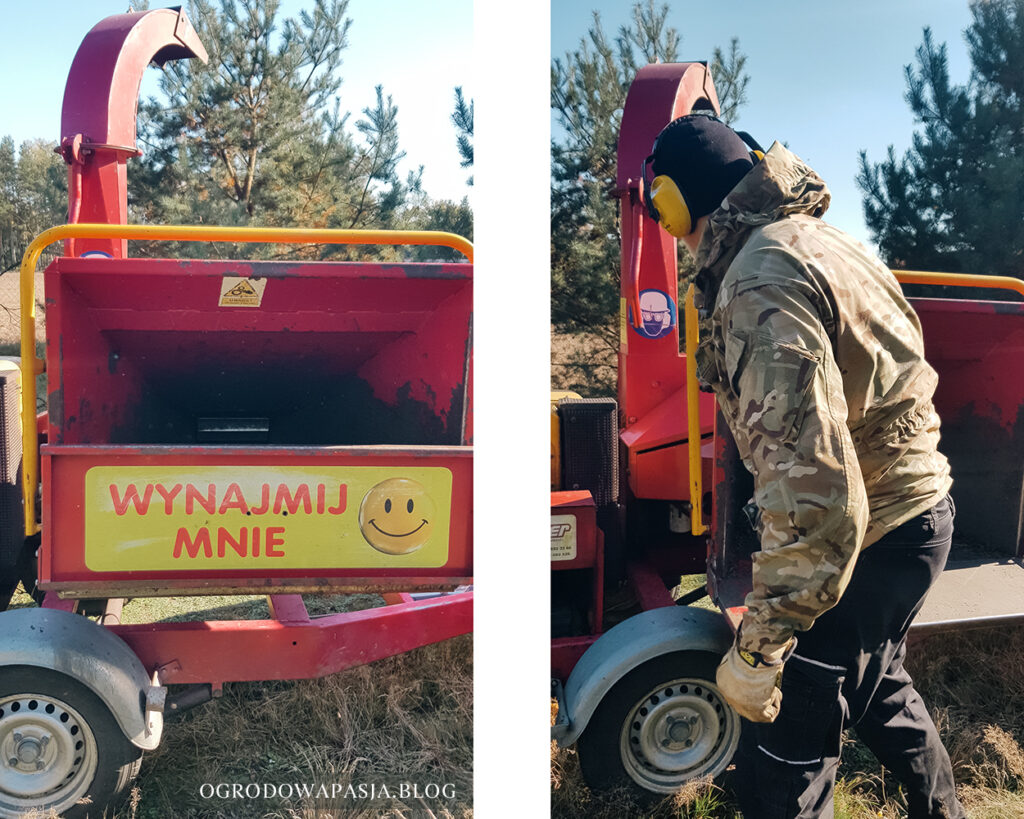 My z powodzeniem korzystamy z wypożyczalni, gdzie testujemy sobie różnej wielkości urządzenia i dzięki temu przekonałam się czego tak naprawdę potrzebuję, a co tylko wydawało mi się, że potrzebuję. Najlepszym możliwym scenariuszem w moim przypadku jest zakup niewielkiego spalinowego rębaka, lekkiego i poręcznego, aby na bieżąco rozdrabniać niewielkie patyki trafiające na kompost, a oprócz tego, raz lub dwa razy do roku (czyli dokładnie tak, jak to ma miejsce w tej chwili) korzystać z porządnego sprzętu, który niewielkie drzewka rozdrabnia w ciągu sekund, a człowiek nie nadąża pakować, bo maszyna połyka i mieli wszystko niemal w czasie rzeczywistym. Rębak, który wyjątkowo przypadł nam do gustu i którym praca szła sprawnie (nie napiszę „lekko” bo cały dzień pakowania gałęzi z miejsca A do miejsca B nigdy nie jest pracą lekką) to taki, który zrębkuje gałęzie do 15 cm średnicy, więc już naprawdę całkiem sporo. Dla zobrazowania: